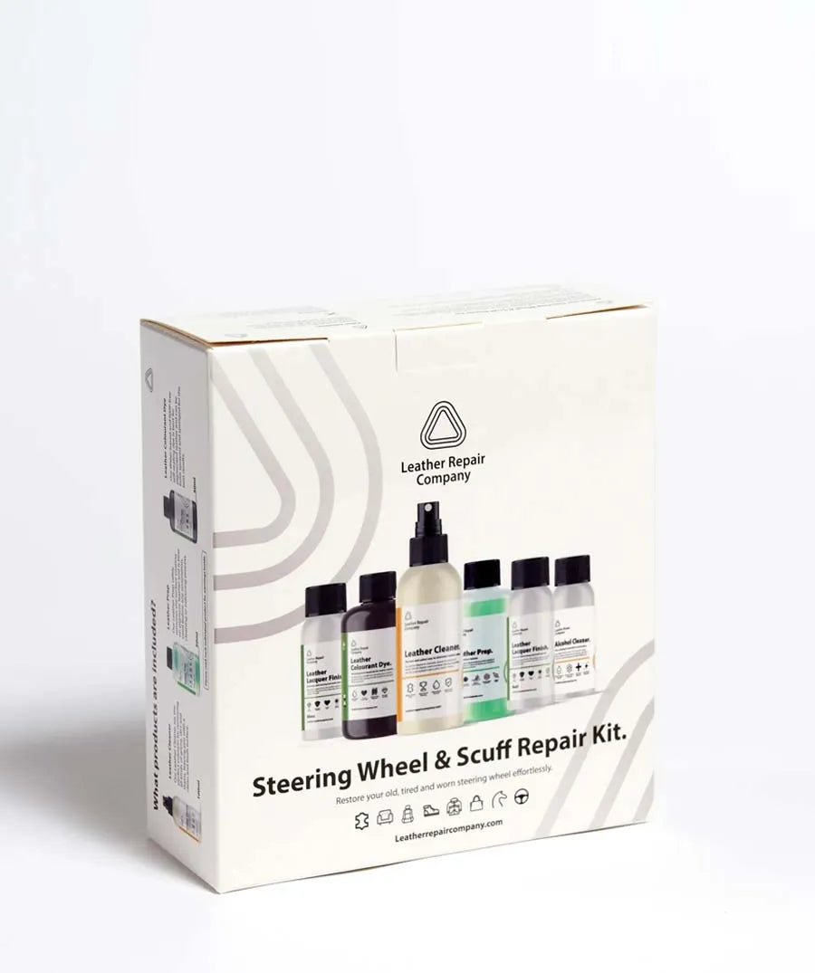 Our leather Steering Wheel & Leather Scuff Repair Kit is an all-in-one DIY professional repair kit to restore your leather steering wheel with professional results by removing the old sticky, cracked or peeling leather and leaving you with a crisp new feeling leather steering wheel.